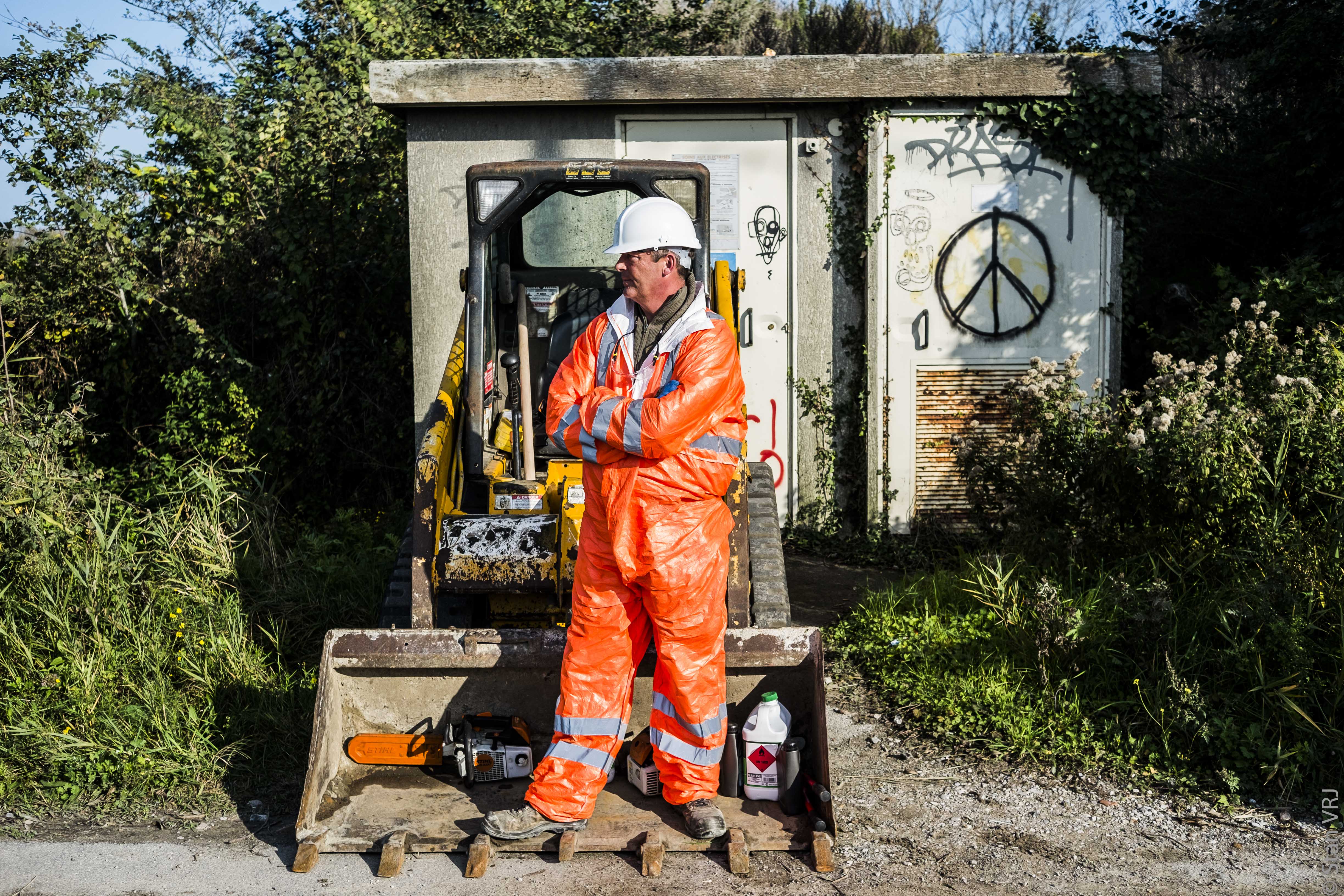 Un ouvrier de chez Opale environnement gardant sa mini pelleteuse. ©Stan Vrj – Calais – 25 octobre 2016