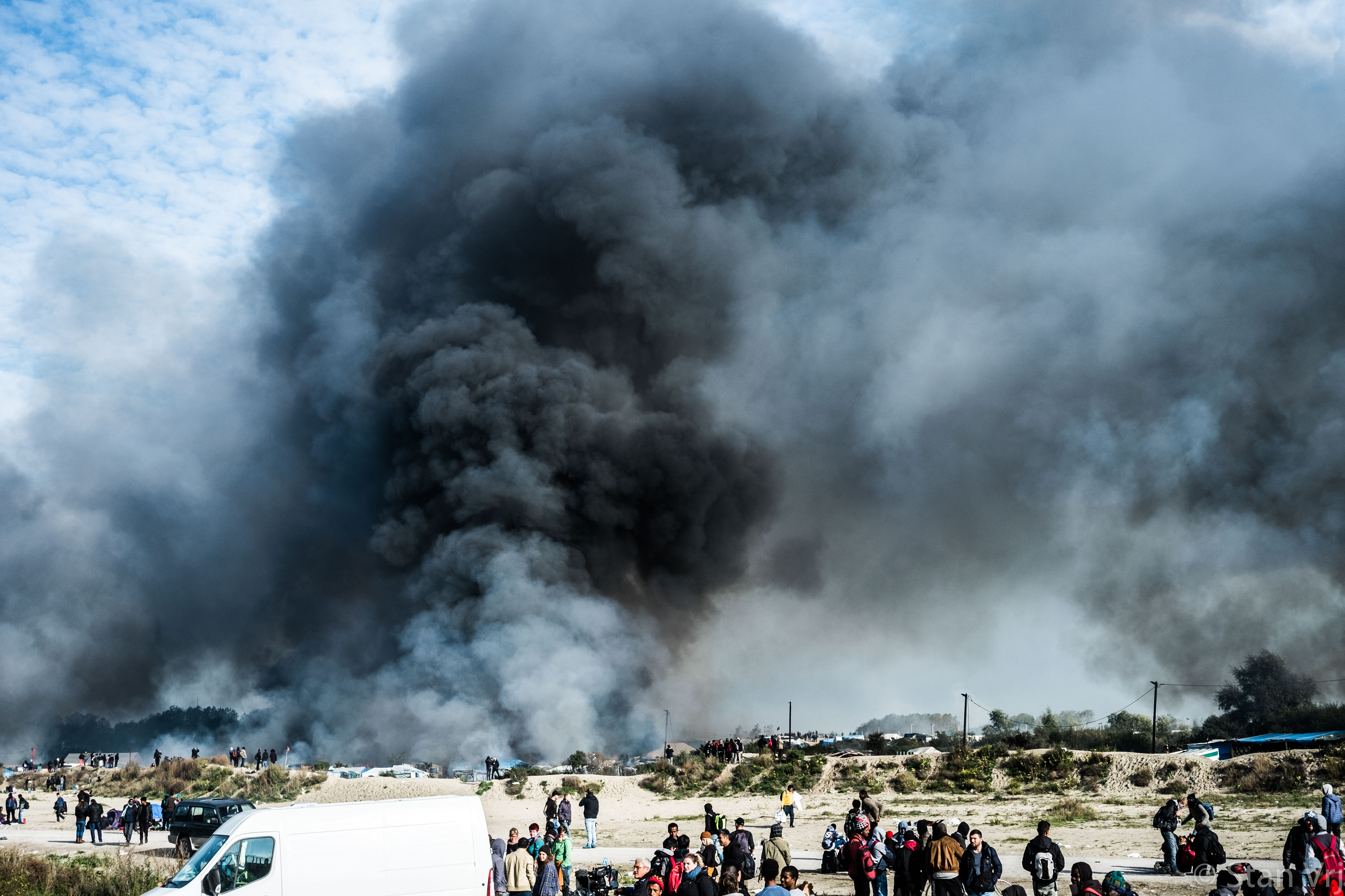 Des maisons en feu en signe de contestation face à l’évacuation de la « jungle » ©Stan Vrj – Calais – 26 octobre 2016