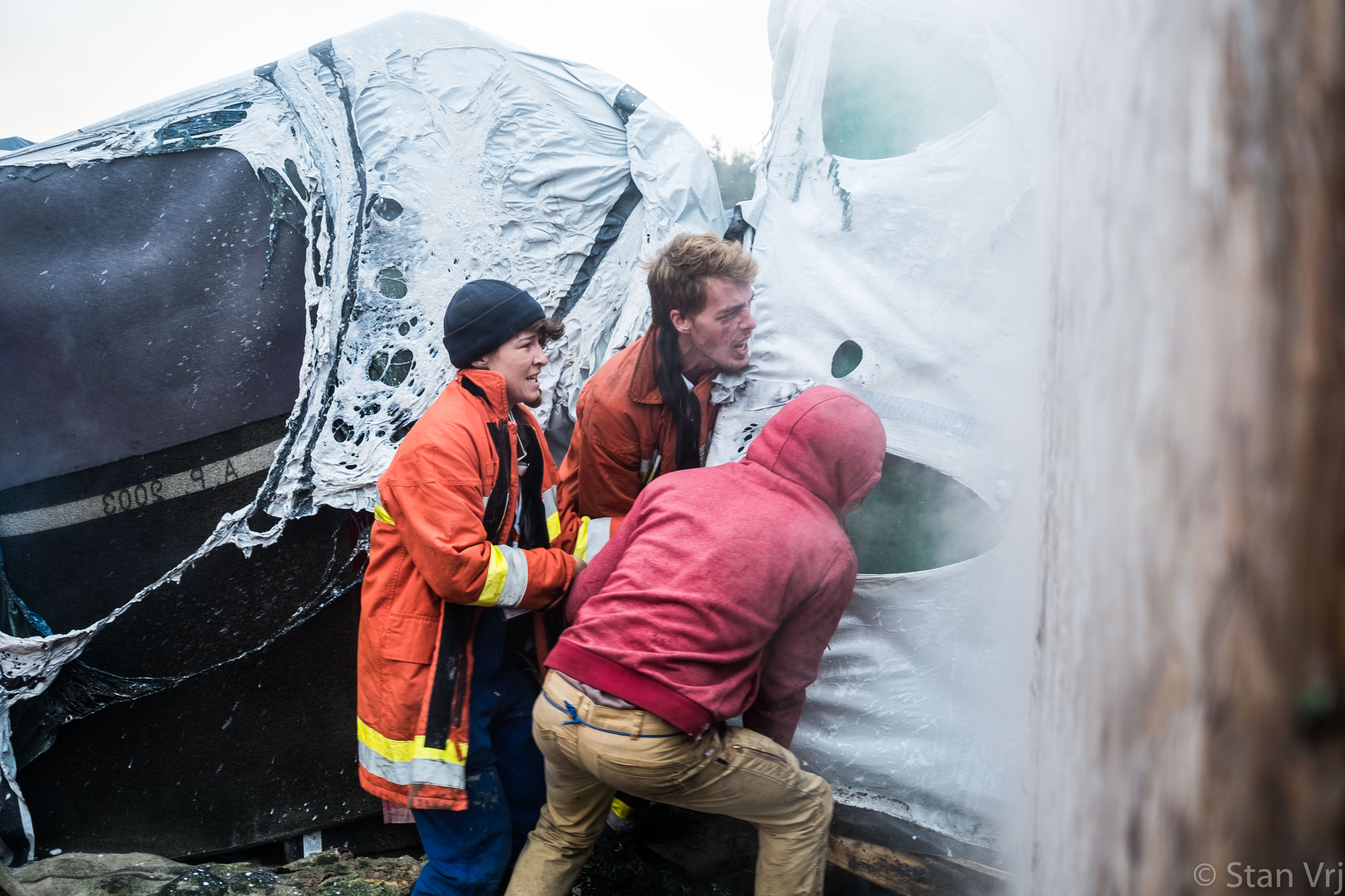 Les pompiers volontaires et un bénévole renversant une tente pour éviter la propagation des feux. ©Stan Vrj – Calais – 26 octobre 2016